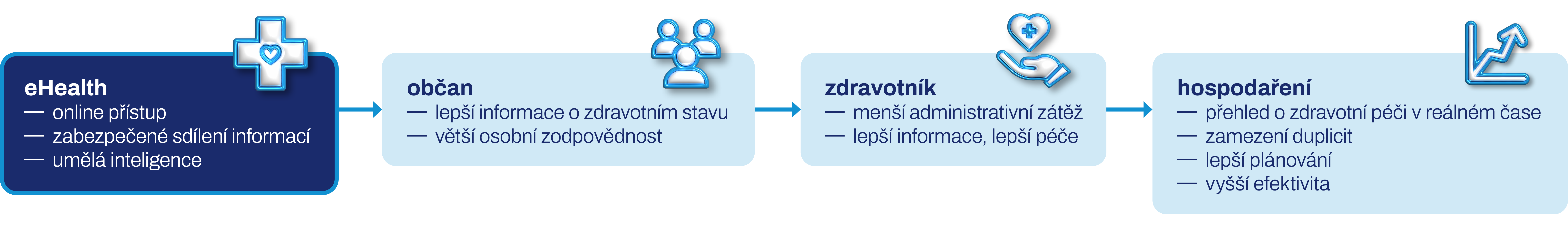 Pokud se tyto služby zavedou správně, pomohou občanům k lepší znalosti jejich zdravotního stavu okamžitým online přístupem k jejich zdravotnické dokumentaci, což povede také k vyšší osobní odpovědnosti za jejich zdraví. Přesun od „papíru“ k zabezpečenému přenosu zdravotních dat a využívání umělé inteligence při vedení zdravotnické dokumentace zase povede ke snížení administrativní zátěže zdravotníků. A sdílení agregovaných dat zase umožní schopnost vidět, co se děje v reálném čase a povede k zamezení duplicit, lepší schopnosti plánovat a tím ke zvýšení kvality péče o pacienta a efektivity systému.