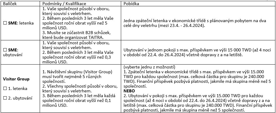 Upozorňujeme, že nabídky platí do vyčerpání finančního rozpočtu a balíčky jsou poskytovány podle pořadí přijetí přihlášky. Pro registraci a podání pobídkové přihlášky vyplňte prosím přiložený formulář "company profile" a zašlete jej na emailovou adresu czech@sa.moea.gov.tw nebo cztwec01@sa.moea.org.tw .