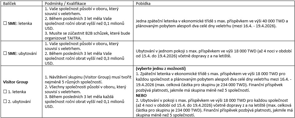 Na podporu účasti na tomto veletrhu nabízíme následující pobídkové balíčky. Upozorňujeme, že nabídky platí do vyčerpání finančního rozpočtu a balíčky jsou poskytovány podle pořadí přijetí přihlášky. Z balíčku pobídek si můžete vybrat pouze jednu možnost.