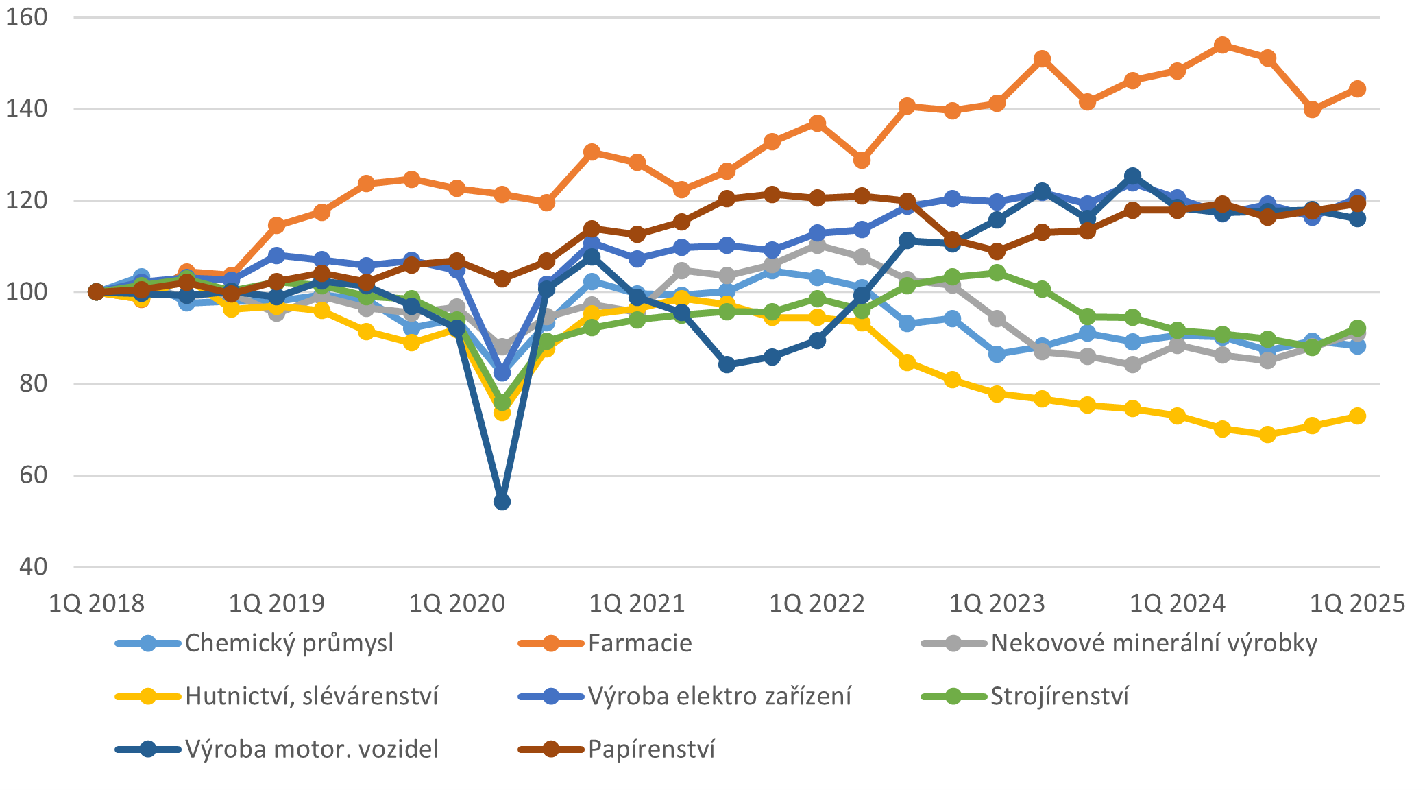 Produkce vybraných sektorů průmyslu mezi lety 2018-2025