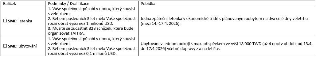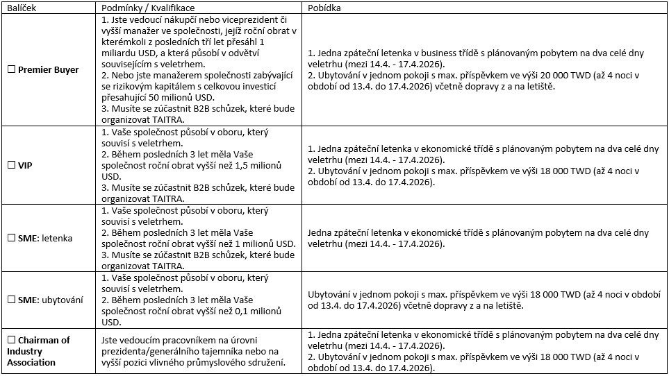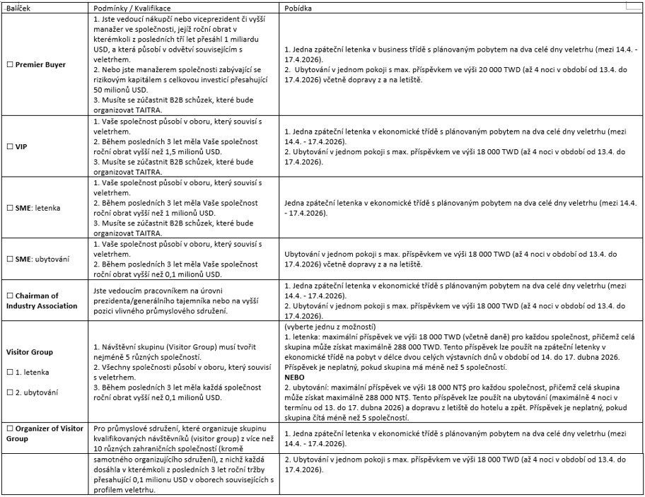 Pro registraci a podání pobídkové přihlášky vyplňte prosím přiložený formulář "company profile" (AMPA, AUTOTRON, E-MOBILITY) a zašlete jej na emailovou adresu czech@sa.moea.gov.tw nebo cztwec01@sa.moea.org.tw.