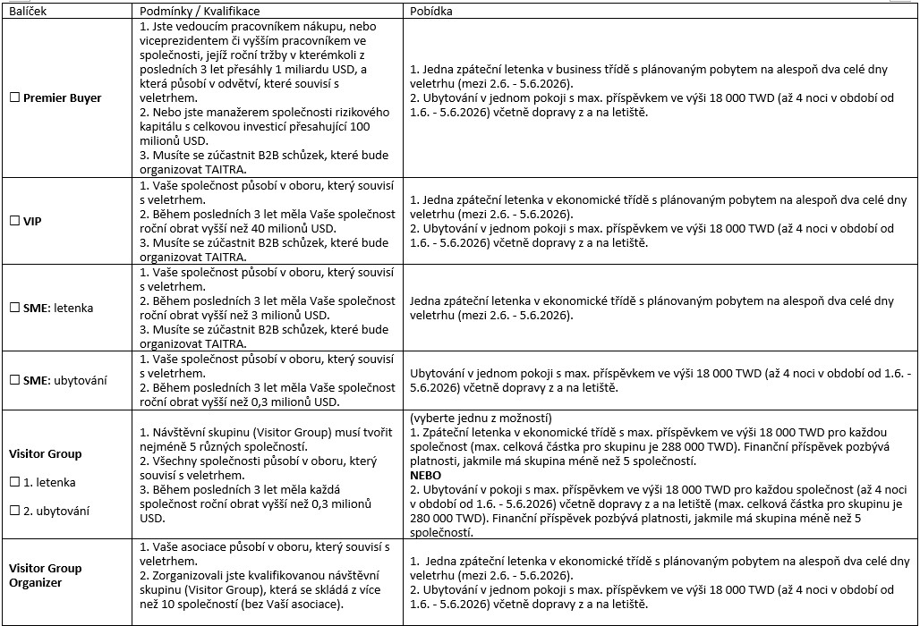 Na podporu účasti na tomto veletrhu nabízíme následující pobídkové balíčky. Upozorňujeme, že nabídky platí do vyčerpání finančního rozpočtu a balíčky jsou poskytovány podle pořadí přijetí přihlášky. Z balíčku pobídek si můžete vybrat pouze jednu možnost.