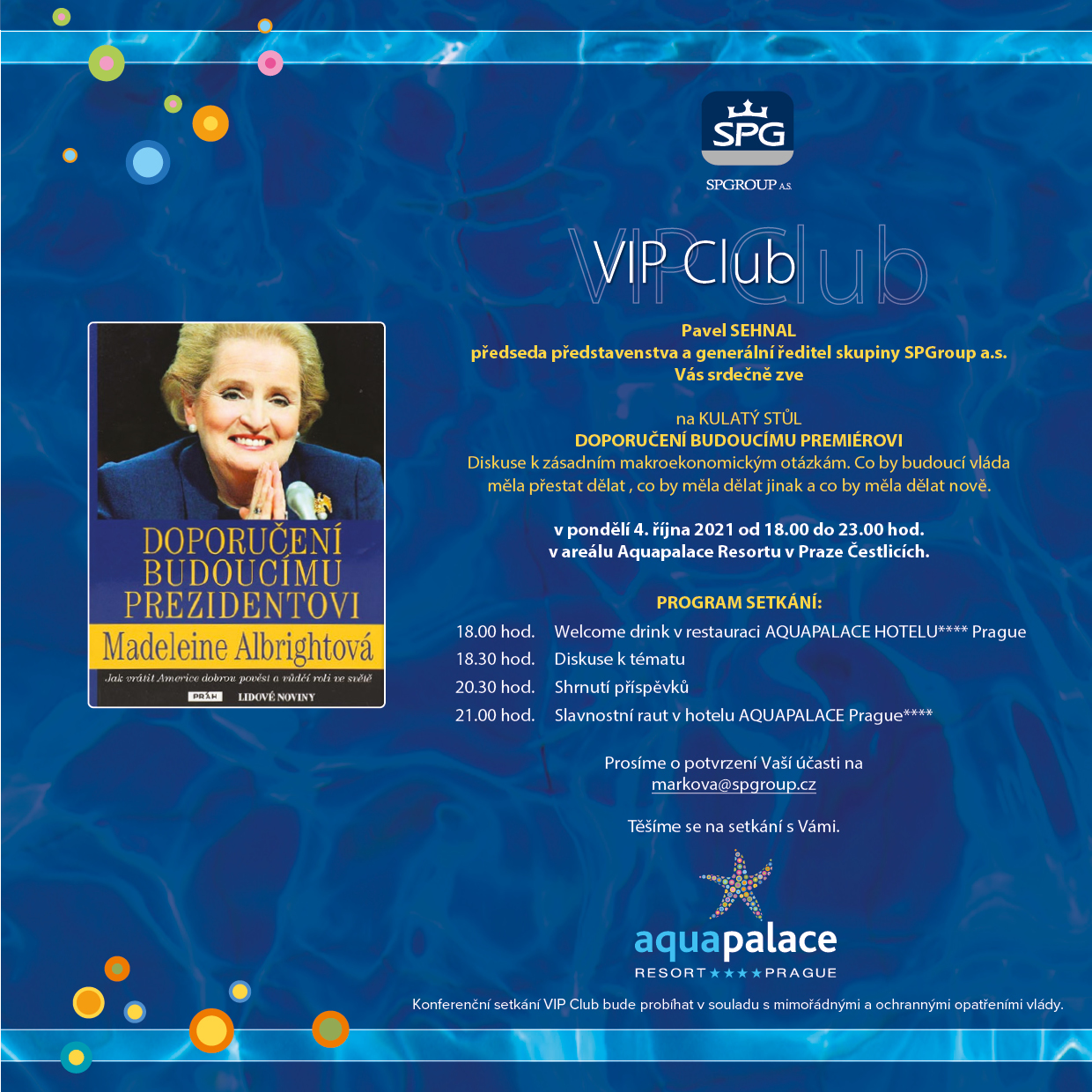 SPGroup a.s. a předseda předstanstva Pavel Sehnal zve na interdisciplinární diskusi u kulatého stolu s názvem „Doporučení budoucímu premiérovi“ dle názvu knihy Madelaine Albright Doporučení budoucímu prezidentovi. Obsah diskuse se bude týkat základních makroekonomických otázek, co by budoucí vláda měla přestat dělat a co by měla dělat jinak v souvislosti s nastavením vhodných podmínek pro podnikatelský sektor s efektem oživení ekonomiky. Více informací v pozvánce zde.