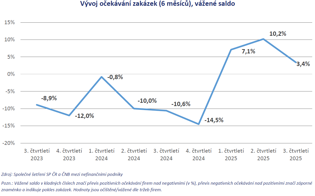 Z již tradičního společného šetření Svazu průmyslu a ČNB mezi nefinančními podniky vyplývají za 3. čtvrtletí 2025 příznivé signály. Firmy vyhlíží pozitivnější trend vývoje zakázek. Na druhou stranu však během roku znatelně revidovaly predikci investic a v následujících měsících dokonce čekají mírné snížení investiční aktivity. Stále tedy pozorujeme mírné oživení ekonomiky a poptávky, nicméně dlouhodobé nejistoty přetrvávají a chybí stabilnější prostředí pro investice. To by měl být i jeden z úkolů nové vlády.