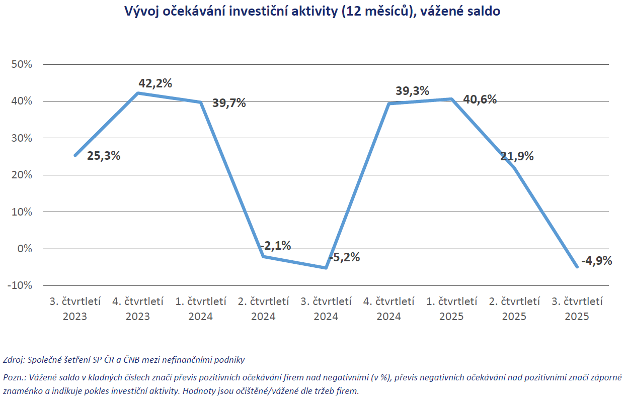 Tomu odpovídá i šetření SP ČR a ČNB za 3. kvartál, kdy firmy vyhlíží v následujících 6 měsících jen dílčí zvýšení investic (pozitivní saldo 6,2 %) a v následujících 12 měsících dokonce mírné zhoršení (negativní saldo 4,9 %), přitom ještě na počátku letošního roku byl očekáván znatelně příznivější obrat.