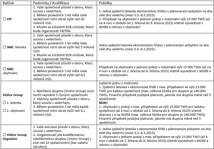 Na podporu účasti na tomto veletrhu nabízíme následující pobídkové balíčky. Upozorňujeme, že nabídky platí do vyčerpání finančního rozpočtu a balíčky jsou poskytovány podle pořadí přijetí přihlášky.