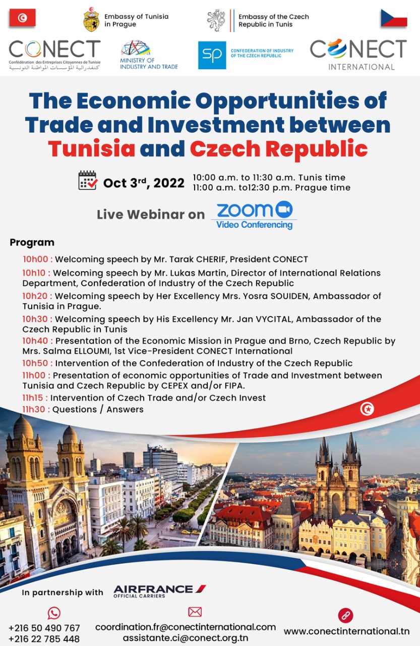 U příležitosti incomingové tuniské podnikatelské mise pořádá SPČR ve spolupráci s tuniským partnerem CONECT tunisko-české podnikatelské fórum, které proběhne ONLINE 03.10.2022 od 11:00h.