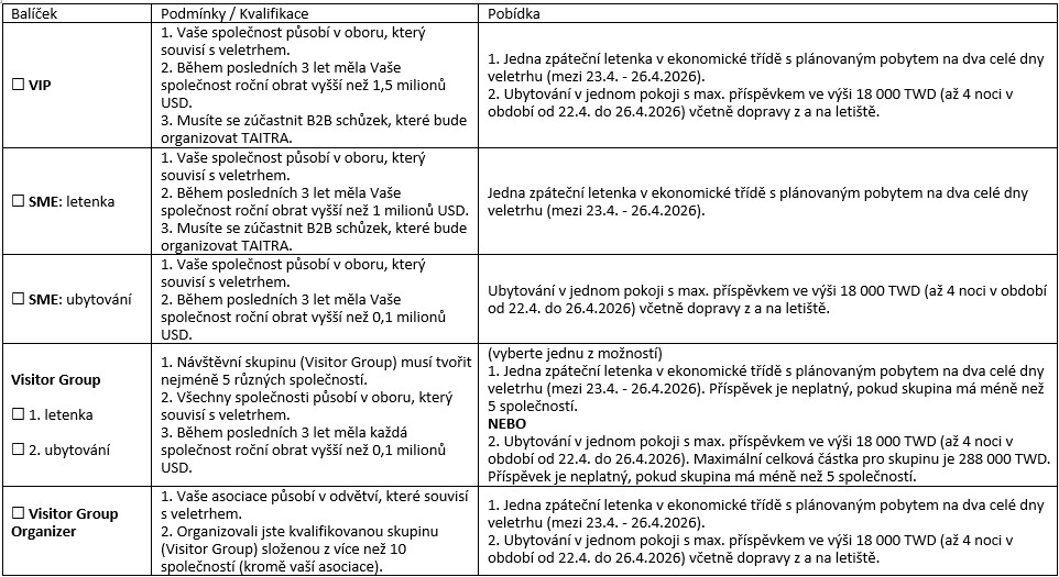 Na podporu účasti na tomto veletrhu nabízíme následující pobídkové balíčky. Upozorňujeme, že nabídky platí do vyčerpání finančního rozpočtu a balíčky jsou poskytovány podle pořadí přijetí přihlášky. Z balíčku pobídek si můžete vybrat pouze jednu možnost.